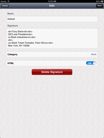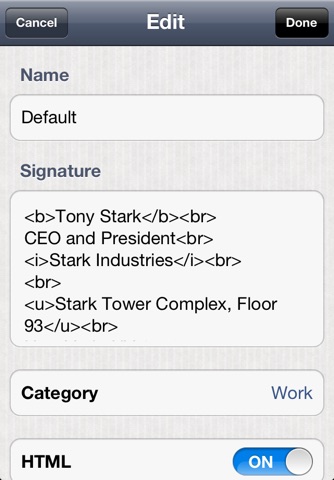 The Quick Signature app allows you to store an unlimited number of email signatures to use when composing emails. It allows you to store all of your created signatures into an unlimited number of categories such as Work and Home.