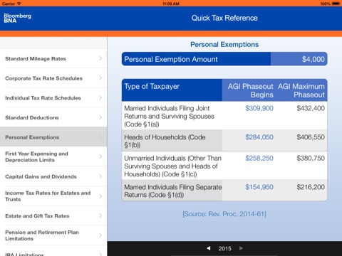 BNAs Quick Tax Reference Guide is perfect for when youre on the go, need to make a quick reference, or are meeting with clients. This app allows you to change your year of reference quickly and calculates taxable income for different filing statuses.