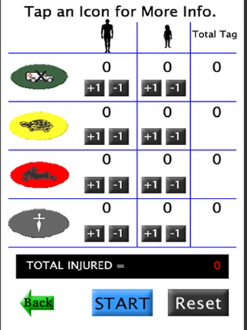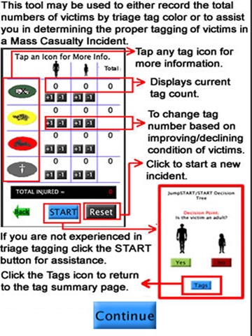 The Quick Triage App integrates the S.T.A.R.T. Triage Protocol for adults and the JumpSTART Triage Protocol for children into a single tool. Its primary purpose is to provide the First Responder an easy to use tool to assist in rapid sorting and tagging of casualties in a Mass Casualty Incident and in tracking the number and type of tags applied. Tag color and tracking can be easily changed to correspond to changes in patient condition. This App will also enable First Responders to more quickly provide accurate casualty notifications to hospitals preparing to receive casualties. The app enables any person to accurately assign a triage category/tag to victims of all ages involved in a mass casualty incident.