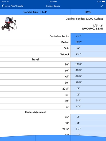Edit and view all of your benders specifications. Detailed information on the centerline radius, deduct, gain, setback. Plus the ability to view the travel, and radius adjustment for any degree bend between up-to 90°. All of this is visualized and edited within the Bender Specs.
