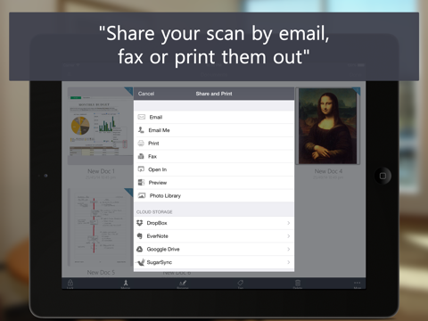 It enables you to quickly scan documents on the go and email the scans as JPEG or PDF with multiple pages. You can easily export your scan to DropBox, EverNote,SugarSync and other cloud services.
