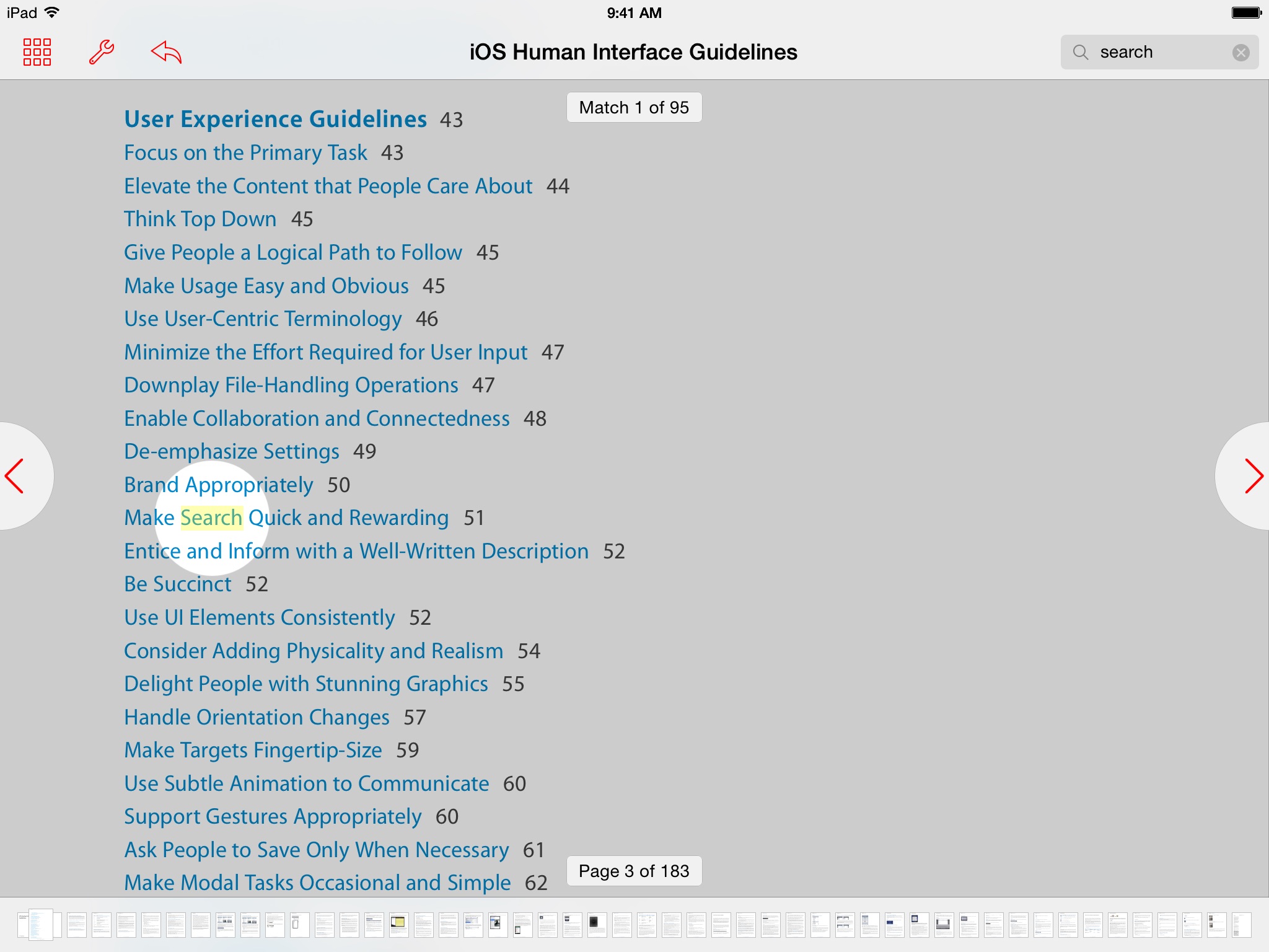 It’s also a great PDF viewer with a very natural style of navigation. It snaps to page boundaries, yet it’s easy to flick past them. Zooming is straightforward by pinching, or you can double-tap a region of text to zoom to fit. You can easily jump to any part of the document using the scrub bar. And everything is lightning-fast, even on large documents.