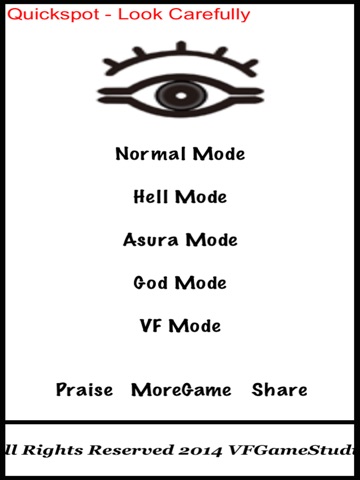 "Quickspot" is a very playable casual puzzle game by VFGameStudio original production, is the second and a "Dont tap the white tile", "One cannot die" after the hand-made child abuse center child hand-eye tour masterpiece, simple style of the game was able to give players endless fun game is divided into five challenging modes, each with a different degree of difficulty, within a certain time limit, players using their eye to identify each a crossing pattern and click flaws, winners continue to the next, then failed again. The game requires players to have enough vision, concentration and luck