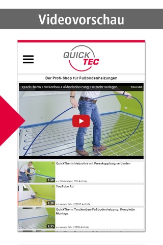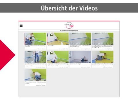 Mit dieser App haben Sie alle Videos zur QuickTherm Fußbodenheizung auf einen Blick. Die Montagevideos lassen sich schnell und einfach während der Verlegung abrufen – und zwar genau dann, wenn sie benötigt werden.