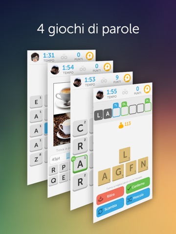 Su Quickwit potrai sfidare i tuoi amici a divertenti giochi di breve durata, come Paroliere, Flappy, Candy, Bubbles, 2048, Scarabeo, Trivia , "Nomi cose animali e città", il gioco dei Film e "4 Immagini 1 Parola".
