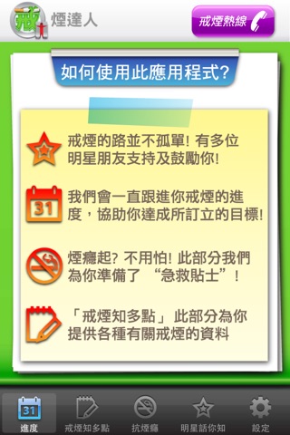 Together, we can create a smoke-free Hong Kong. The Tobacco and Alcohol Control Office of the Department of Health is launching this Quit Smoking App to assist smokers to overcome tobacco dependence.