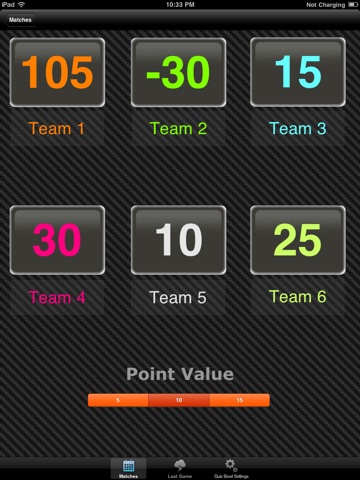 Keep score at your next Quiz Bowl competition. Allows up to 6 teams to be tracked using three point value categories (5, 10, 15) with the touch of a button.