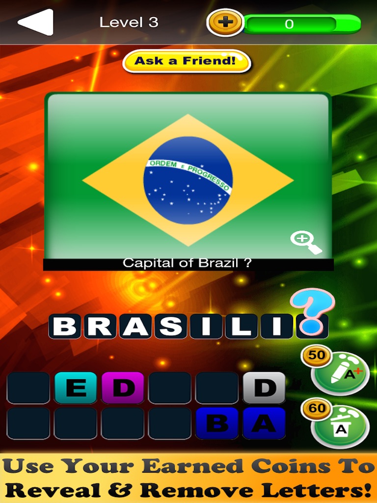 Can you guess all the countries flags? Look at the flag picture and read the free hint, and spell the capital name of that country! If you need help use the reveal or remove letters power ups. You can also ask your friends for help via Facebook, Twitter or simply email them.