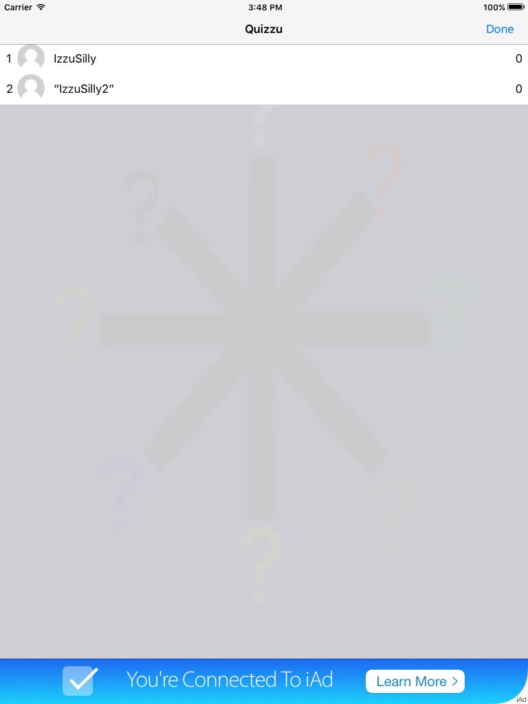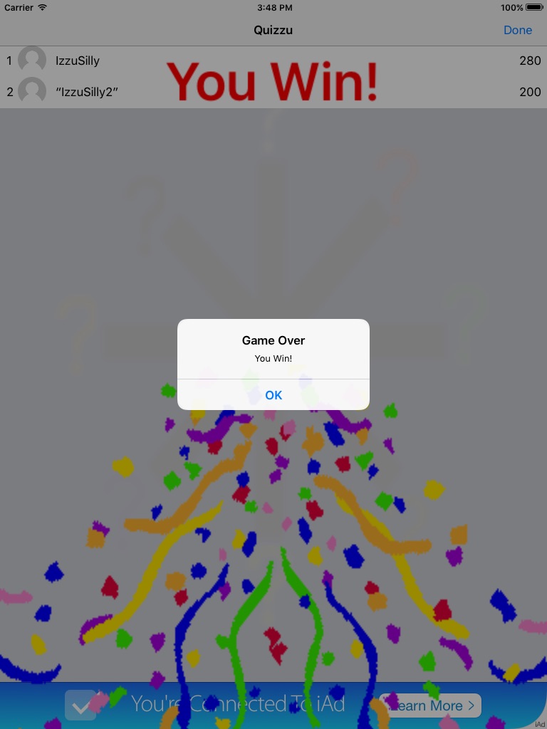 1. Quizzu allows you to play up to 15 players taking turns, 4 playing head to head online (all logged into the game center at the same time), or 8 playing head to head offline.
