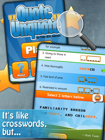 Quote Unquote is a unique mix of crossword-style clues and pithy quotations. Solve clues by searching for the answers within quotes from some of the greatest minds of all time--and some of the not so great ones, too. Some quotes are famous, some are wise, some are funny, some are lies!