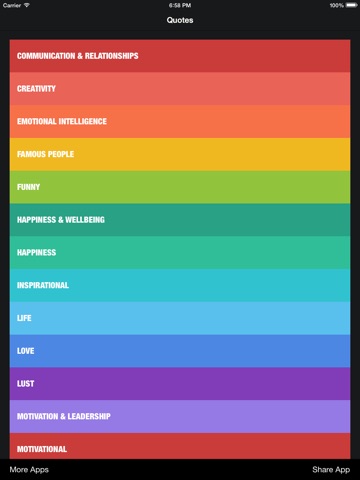 Popular Categories include: Communication and Relationships , Creativity , Emotional Intelligence , Famous People , Love , Sex , Random , Inspirational , Motivation quotes , Etc.