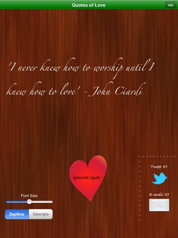 Quotes of Love for the iPad is a quote application filled with romance and love quotes. It has been remastered from its "Quotes of Love" counterpart for the iPhone and iPod Touch, and has a larger database than the iPhone version. The iPad version has a simple to use interface. To get a quote you just simply tap "Generate Quote" on the heart at the bottom of the screen, and one random quote from the database appears on the screen.