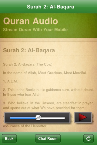 Quran Mobile offers complete high quality Quran audio streams via wifi or cellular networks as well as Quran translation verse by verse to Muslims around the world, with extreme easy to use user interface. Enjoy the mobility with your device, conveniently listen and study Quran with Quran Mobile app. Quran Audio app also supports mobile chat, embedded with quran topics chat room to communicate with people from around the world.