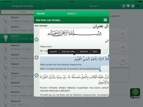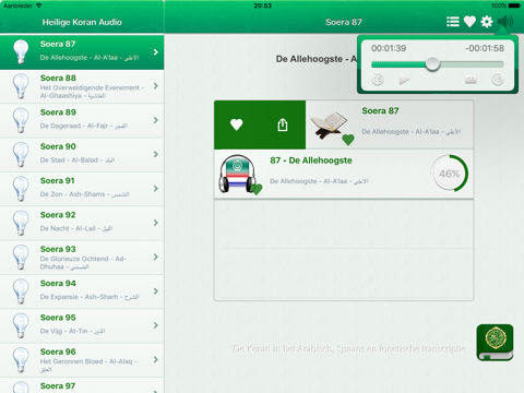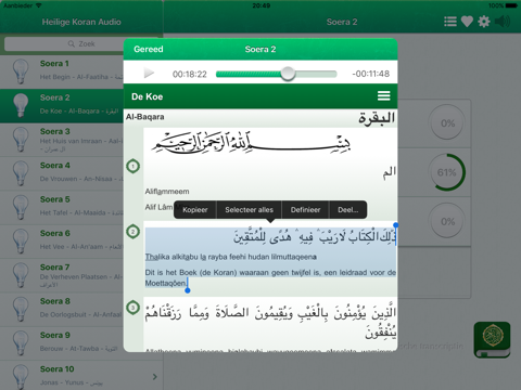 Deze applicatie geeft u de mogelijkheid om te lezen en te luisteren naar alle 114 hoofdstukken van de Heilige Koran op uw apparaat.