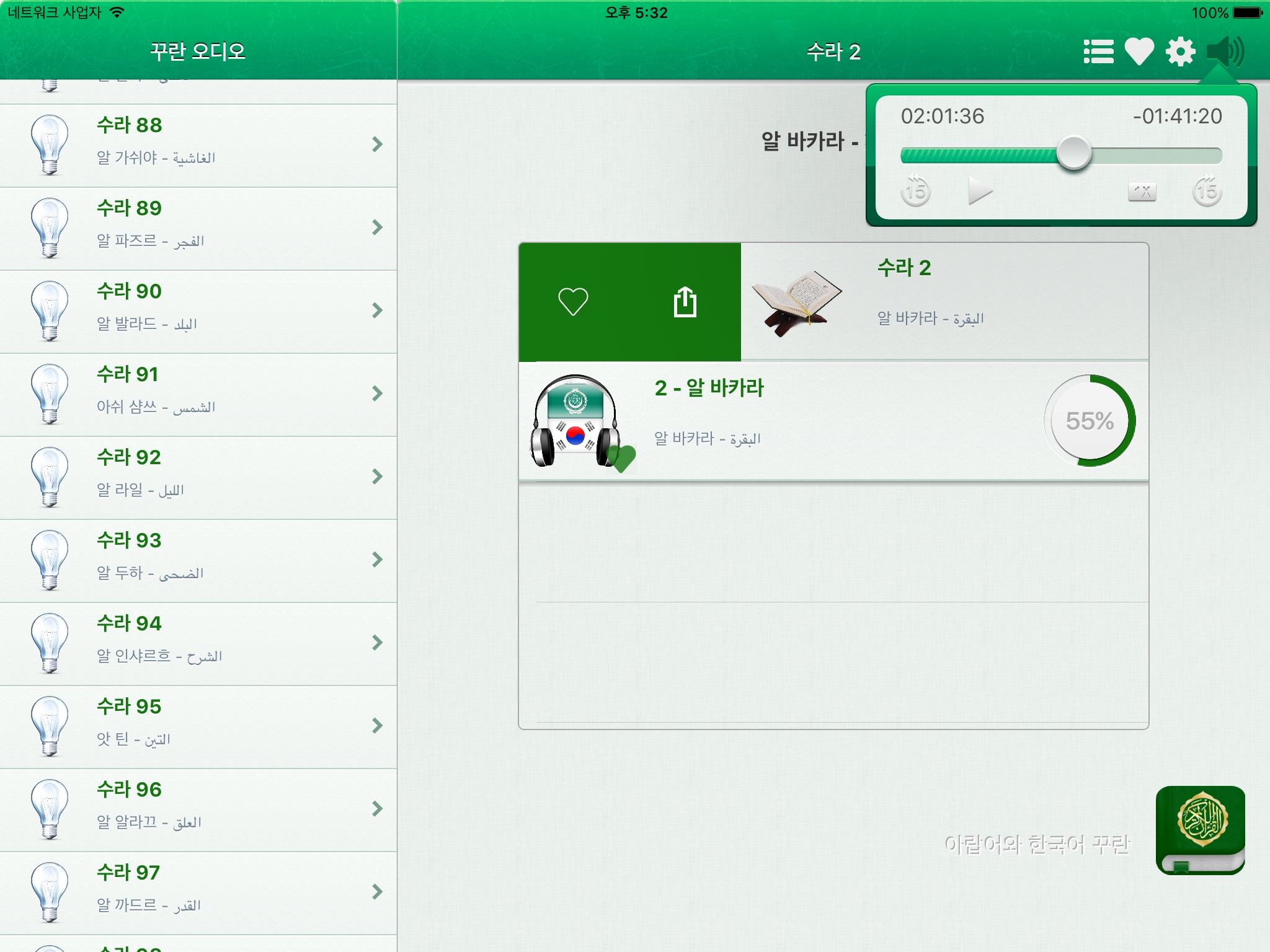 이 응용 프로그램 읽기 및 장치에 거룩한 꾸 란의 모든 114 장에 들어 하는 기능을 제공 합니다.