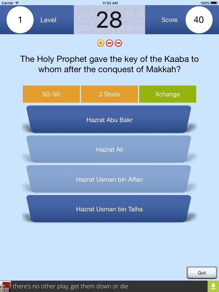 Like the well known "Who wants to be a millionaire?" and other quiz games, Islamic Quiz features 3 lifelines that might come in handy. Use the well-known Fifty-fifty, get a second guess or swap a question for another of your favorite category.