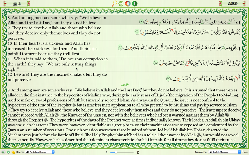 Quran Majeed is an amazing Quran app that beautifies your life with the blessing of reading and listening to the Quran on your Mac. The latest version of the authentic Quran Majeed app for Apple Macintosh offers complete Sura al Baqara in the elegant Uthmanic script proofread by a Muslim scholar (alim), multiple audio recitations and translations.