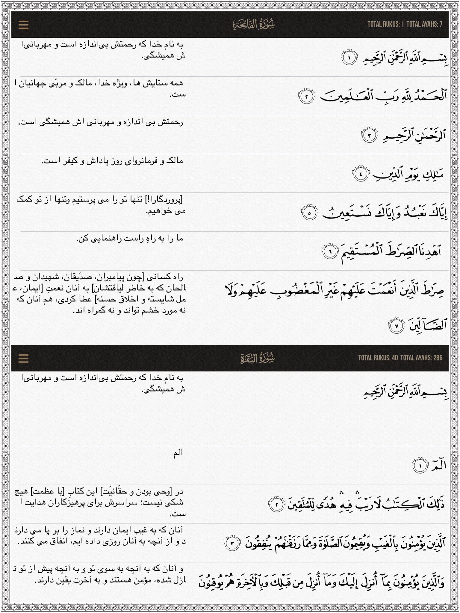 • Quran Persian the ultimate translations of Quran in Persian language and audio recitation from trusted sources. One application after which you do not need to download any other Quran App for Persian translation.
