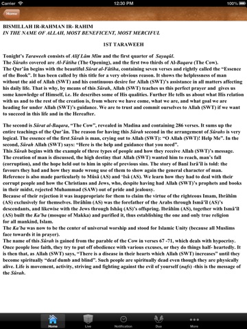 Provides synopsis of Quran for Ramadan tarawih prayer. Simple language and concise summary. It will take only 5-6 minuts to read summary for the each tarawih.