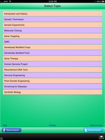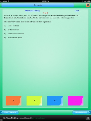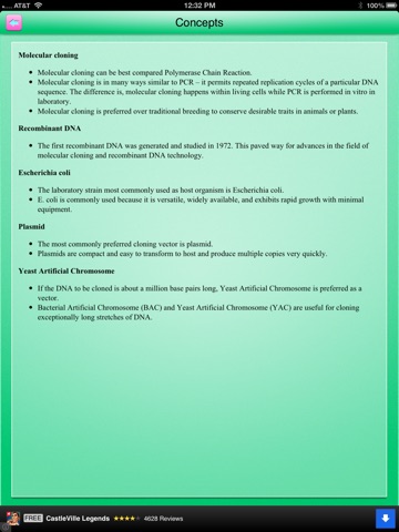 The app allows you to learn Genetic Engineering concepts in a very simple and user friendly manner. In the "Learn" mode of the app, you click on the "Concepts" button, review the "concept text" and then answer multiple choice questions related to the concept that you just reviewed.