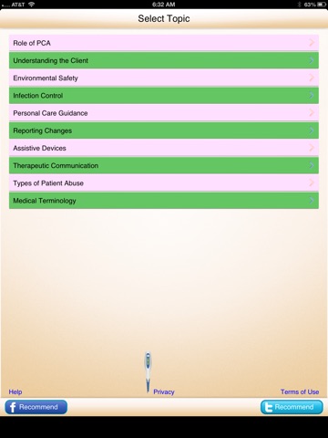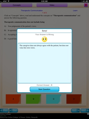 The app allows you to learn and review Caregiver / Personal Care Assistant concepts in a very simple and user friendly manner. In the "Learn" mode of the app, you click on the "Concepts" or "Video" button, review the "concept text" or "concept video" and then answer multiple choice questions related to the concept that you just reviewed.