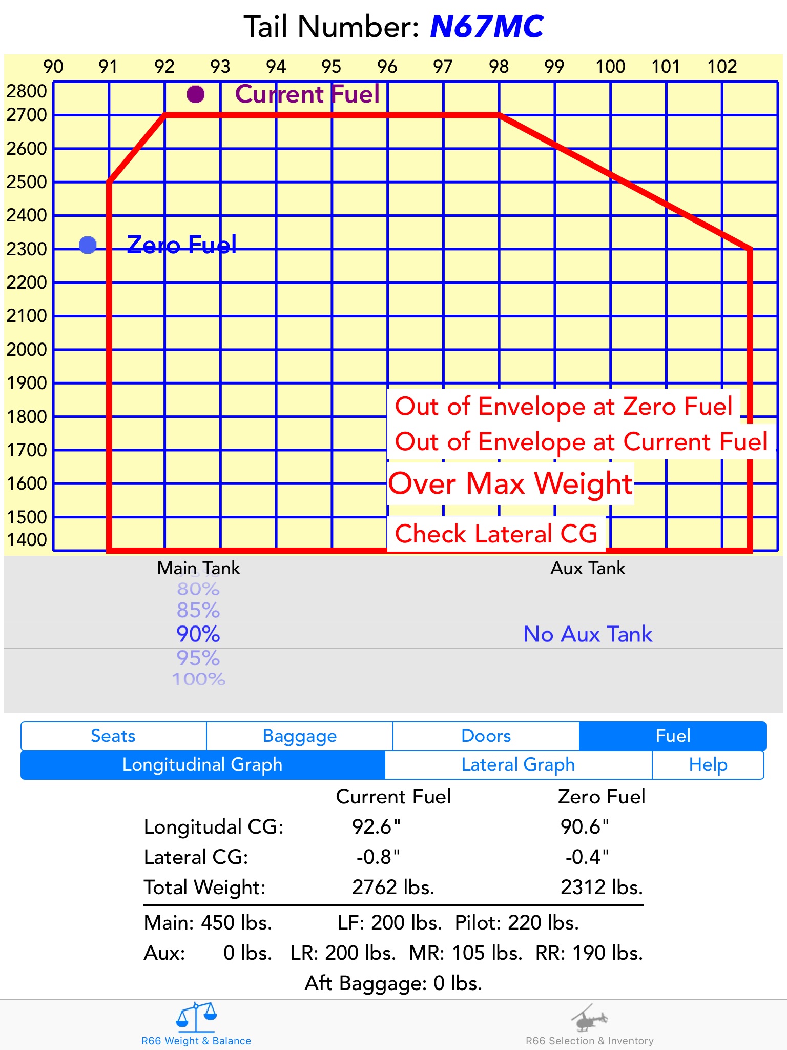 R66 Weight & Balance graphs the center of gravity and weight with current fuel and at zero fuel. Want to know whether or not your heavy passenger *really* has to sit in the back and how much fuel must be maintained to stay in CG? This app will tell you at a much lower cost.
