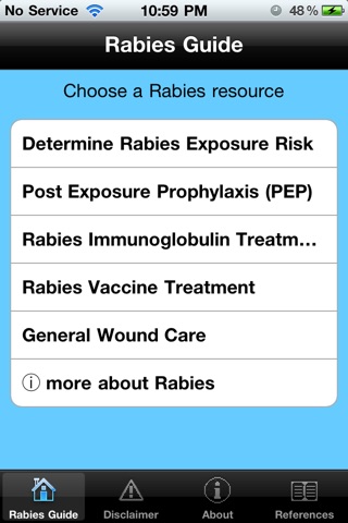 Rabies Guide presents guidance for clinicians handling patients with potential rabies exposure. Based upon the New York State Dept of Health 2010 guideline supplemented by the Center for Disease Control and Prevention, the app walks the provider through the decision steps considering which animal was involved, the nature of the bite or exposure, the availability of the animal for rabies laboratory testing, and details on both rabies vaccine and immunoglobulin treatment.