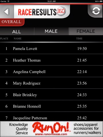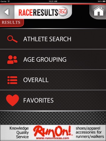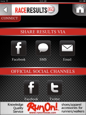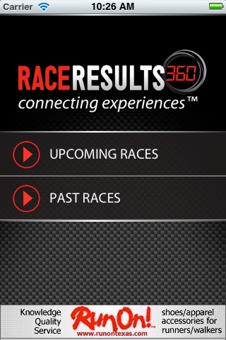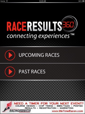 User can view upcoming races and race results powered by the RR:360 results engine™. View and track athlete results, race information, connect with Facebook/Twitter and much more.