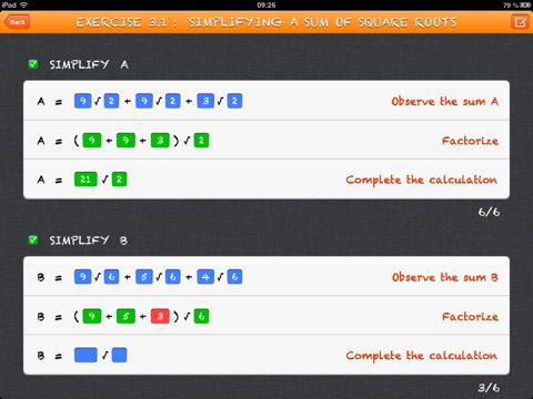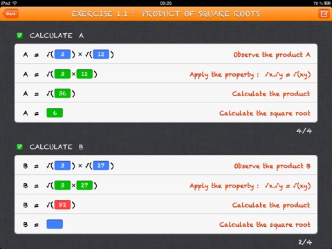 The second part - the exercises - shows 4 exercises that deal with square roots properties : multiplying square roots, dividing square roots, simplifying square roots...