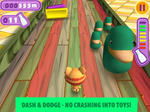 Get your "speed racer" fired up: run through the playroom "race track", swiftly switch sides to avoid the obstacles and rapidly control your cat runner when it reaches "top speed"! Turn every day into a race day and rush through the kids playground! Dodge balloons, toy cars & trucks, rubber ducks, building block toys and other tricky obstacles on your way to glory! Dash through this rally! There is no finish line so run as far as you can and feel the asphalt burn under your feet! Satisfy your need for speed with this "free racing game"!