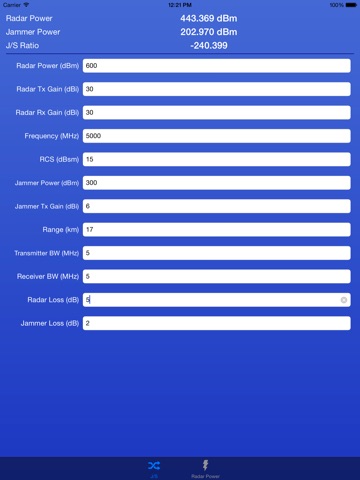 This application calculates the power received by a reflected radar signal (S), the power received by a radar from an RF jammer (J), and the ratio between the two powers (J/S).