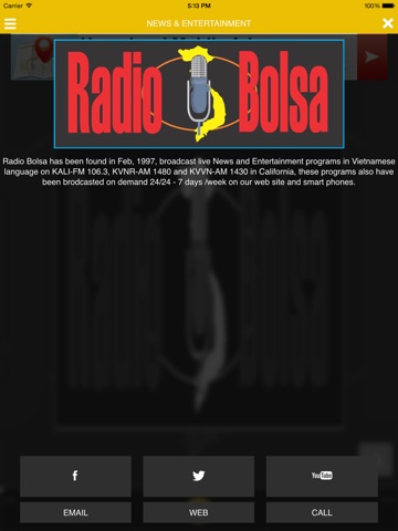 Radio Bolsa broadcast live News and Entertainment in Vietnemese language on KALI-FM 106.3, KVNR-AM 1480 and KVVN-AM 1430 in California. The program also broadcast on demand 24/24 - 7 days / week on our website: radiobolsa.com and on smart phones.