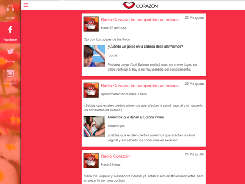 Somos Radio Corazón 94.3 FM. Número 1 en baladas y bachatas. Descarga la app para escucharnos EN VIVO, enterarte de lo último de tus artistas favoritos y conversar con María Pía Copello, Connie Chaparro, Christopher Gianotti o con la conductora que más prefieras vía redes sociales.