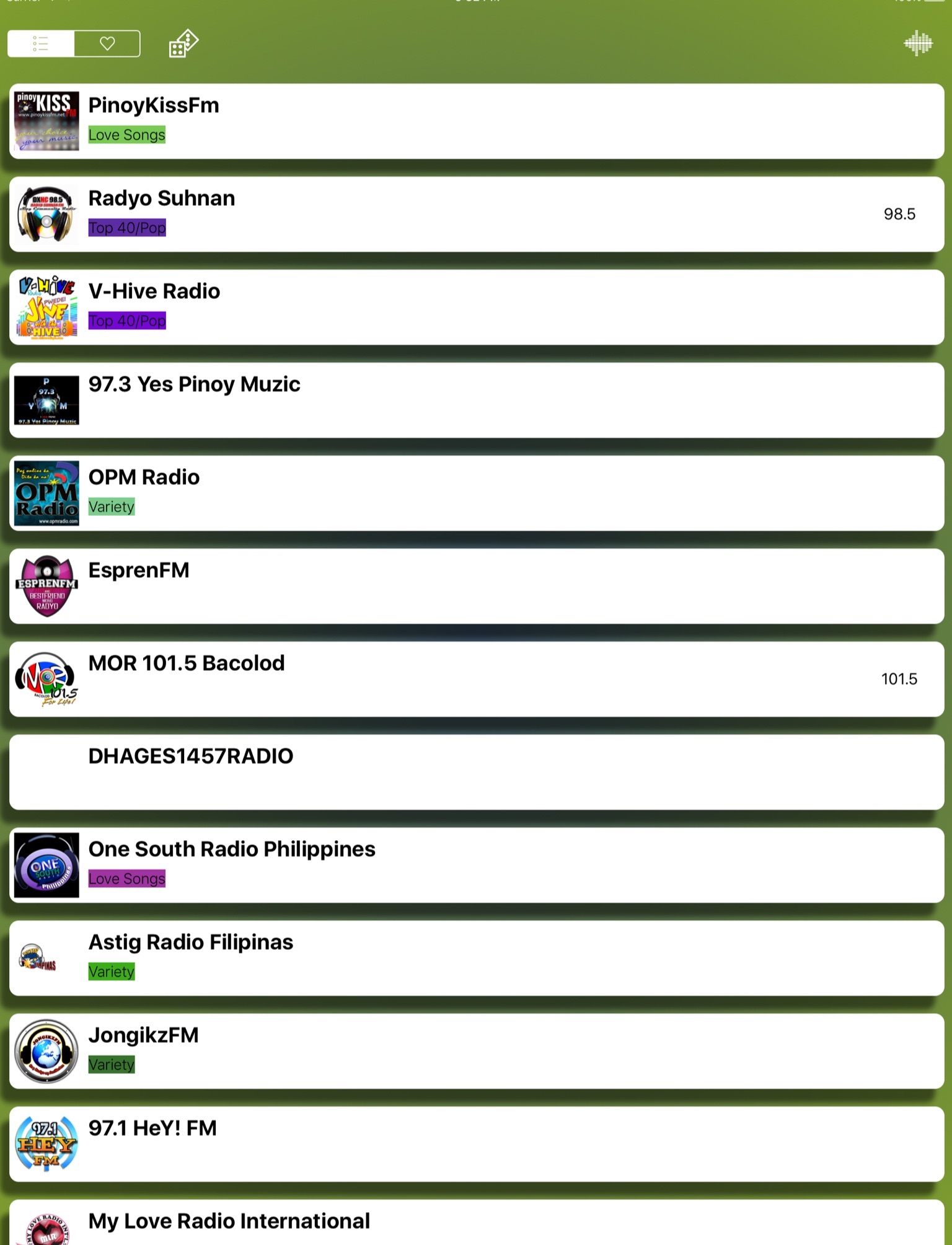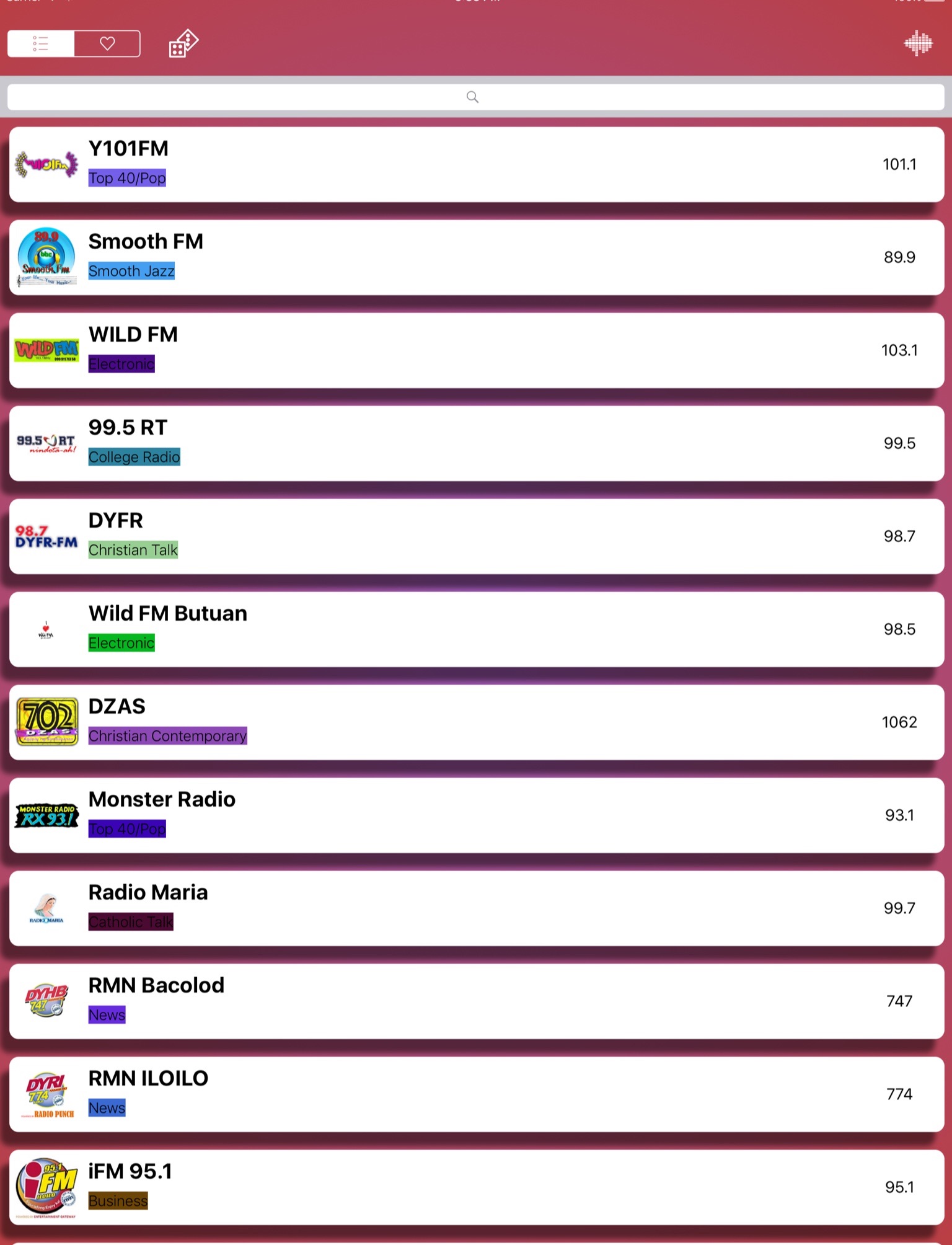 Yes FM, Love Radio, Radyo Romansa, Monster Radio, DZRH, Pinoy Radio, AWFM, iFM, DWFM, MOR, DZXL RMN, Radyo Kabayan, Radio Maria, Rakista Radio, Boracay, PHR, DWIZ, DZAS, Y101FM, Easy Rock etc.