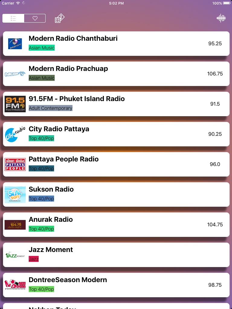 ฟังรายการวิทยุจากสถานีต่างๆ ใน แห่งในประเทศไทย: COOL Fahrenheit 93, เพื่อชีวิต request radio, City Radio Pattaya, Eazy FM 105.5, EFM, SMM Sport Radio 96, Active 99, 95.5 Virgin HITZ, Met 107 FM, 96.5 คลื่นความคิด (Modern Radio), SEED 97.5 FM ...