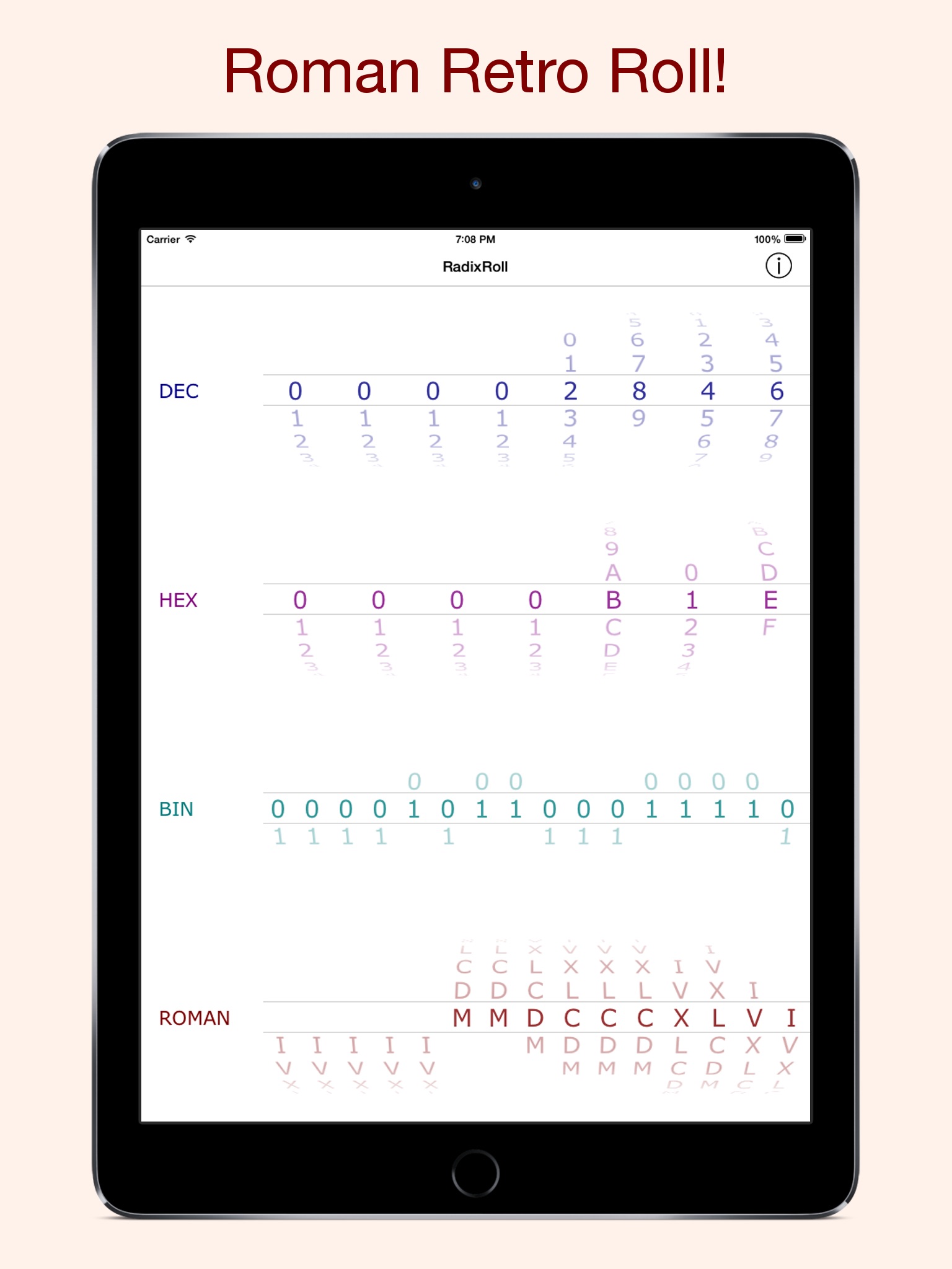 RadixRoll is a neat pedagogic radix converter developed by ApplicVision. The application is available on both iPhone and iPad and lets you easily shift between decimal, hexadecimal, binary and roman numbers.