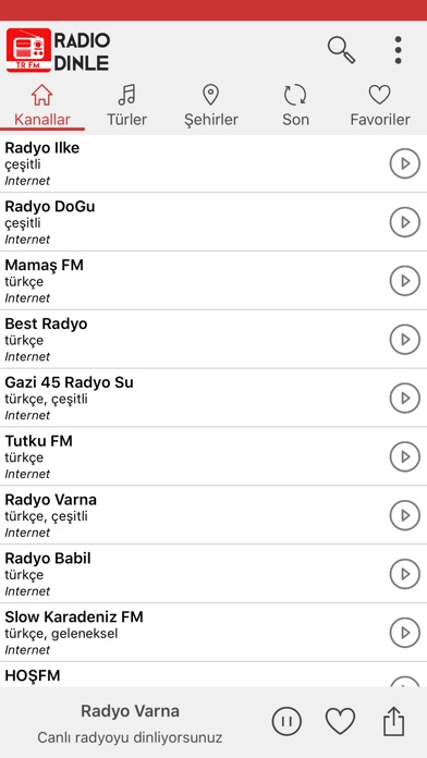 Canli radyolar uygulamadaki kanallarýn popülerliðine göre listelenmiþtir. Sen favori radyonlarýný seçip Oynata bastýðýnda, uygulama arka planda çalýþmaya devam edecek ve sen özgürce telofonu kurcalayabileceksin.