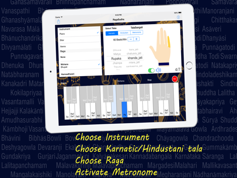 And now we present TalaSangati, for stand alone use or as integrated with RagaSudha. This new app, TalaSangati will accompany you faithfully and help you keep in line with the tala and tempo you have chosen. Its innovative hand gestures and metronome count for Karnatic talas and bol with metronome for Hindustani tals will ensure adherence to the avarthanam/ cycle, allow you to combine multiple cycles while you explore the raga you are playing to the fullest.
