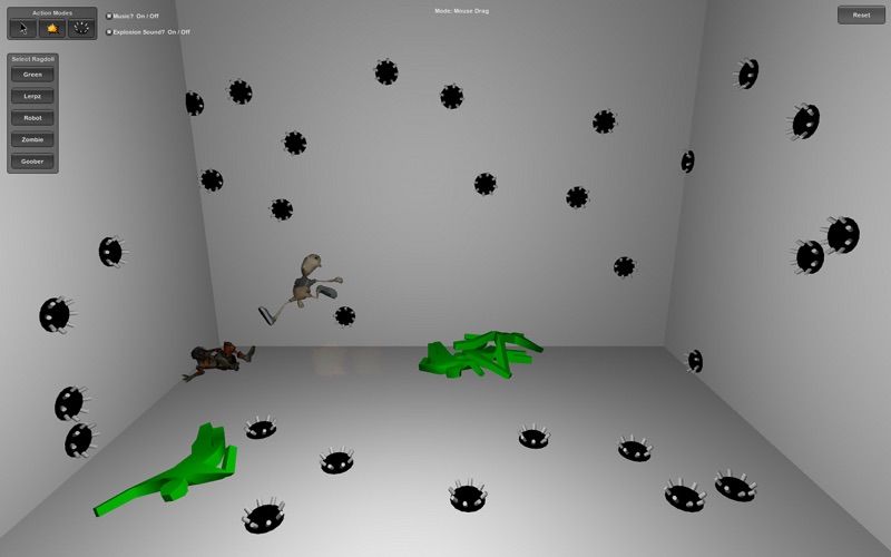 - In "Mouse Drag" mode use the mouse to click and drag on a Ragdoll to move it around the 3D room.
