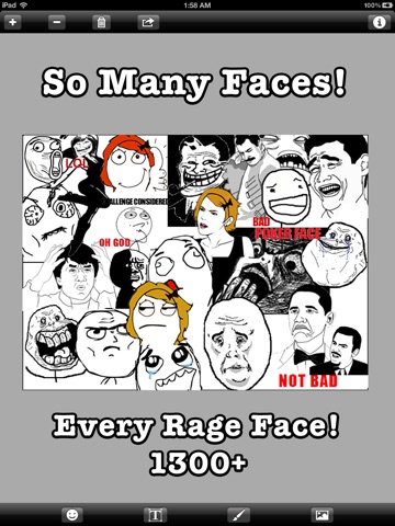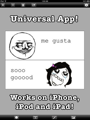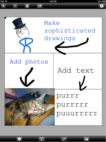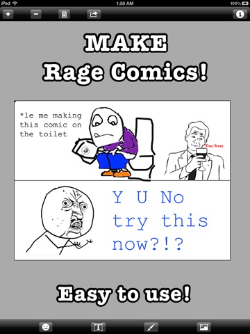 I got this app because I love rage comics and wanted to make my own. This is the perfect tool for that. I have no complaints. Theres a large variety of faces, you can resize and change the color of the text, you can add big or small panels, and you can import photos from your phone.