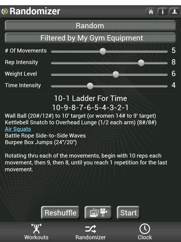Workout Randomizer- Reinvigorate your routine with the Workout Randomizer. This unique feature automatically mixes your workouts and alters each exercise to adapt to your fitness level. Change your number of movements, repetitions, weight level, and time intensity on a scale of 1-10 to match your daily needs and comfort level. Never get bored, keep your body challenged and avoid plateaus.