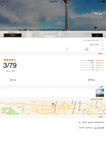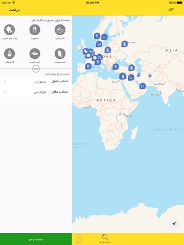کسب و کار هایی مثل رستوران، پزشک ، صرافی ، وکیل و بسیاری مشاغل دیگه که فقط با انتخاب چند گزینه اطلاعات آنها در اختیار شما خواهد بود. به علاوه این اپ با ارایه دادن مکان دستگاه های عابر بانک , پمپ بنزین ها ، سفارت خانه ها ، .... سعی در این دارد که بتواند یک راهنمای جامع در جیب شما باشد.