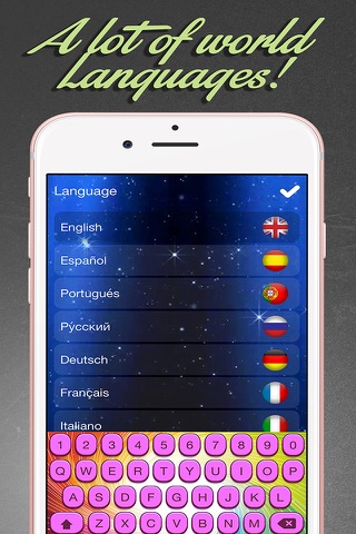 ◆ Select a language and get a English keyboard, German, Italian, Spanish, Russian, Portuguese or Turkish keyboard. Type love messages in the most romantic language in the world by choosing a French keyboard pro!