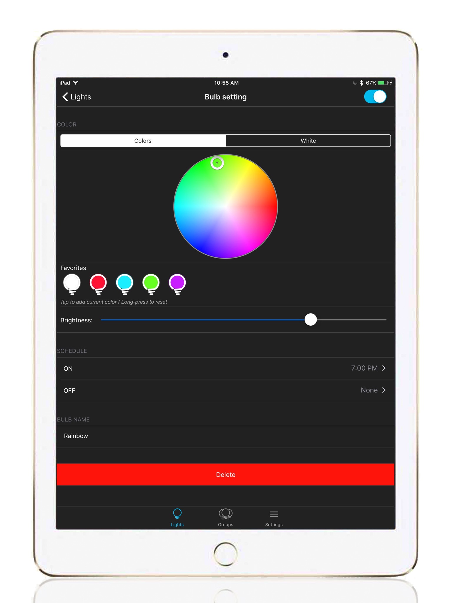 The Rainbow app uses Bluetooth 4.0 for communication through your iPhone, iPod and iPad to directly control your iLuv Creative Technology energy effective multi-color LED smart bulb (sold separately).