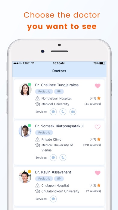 Get a diagnosis or medical advice and treatments from top Thai doctors, no referrals needed. Book an online consultation with leading hospital specialists, including Dermatologists (skin doctor), Paediatricians (child doctor), Psychiatrists, Mental wellness professionals, Urologists, Ob/Gyn (women doctor), ENT specialists, and more.