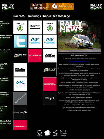Rally News Scavenger delivers all the latest articles from all the greatest sources and social media directly to your device by the MINUTE! With Rally News Scavenger you gain powerful, immediate and in-depth knowledge about the entire world of Rally. Rally News Scavenger does not wait to be updated - it actively “Scavenges” content on your behalf – giving you the most up to date and immersive experience possible within the world of Rally news. Have the latest Rally Articles synced to your device the second they are released – no waiting for RSS updates, or publishing timelines Instantly share the latest articles, tweets and posts directly from the app - be the first to break the latest gossip to your friends... As new Rally sources appear they will be added automatically to the app, you don’t have to do any crazy updates and you’ll never miss a single Rally beat. Your total immersion into the real-time world of Rally awaits…