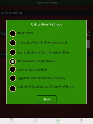 - Different calculation method for Prayer Time according to your region in setting Tab