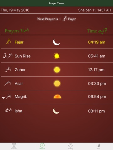 - Prayer Times with highlighting the Next Prayer time and current Islamic date