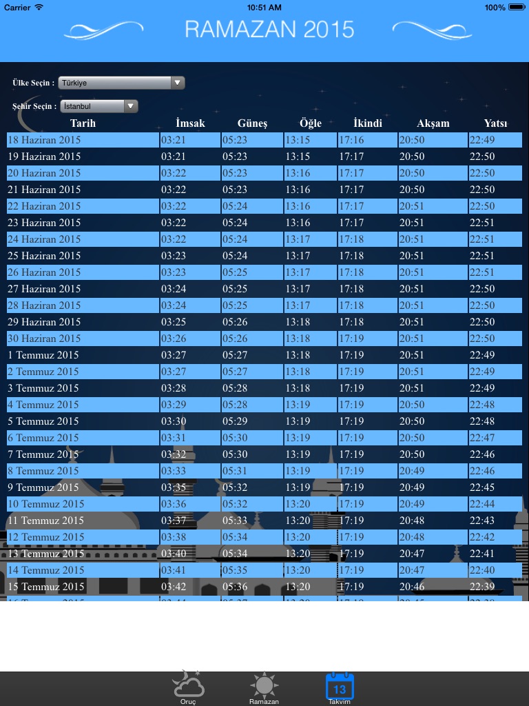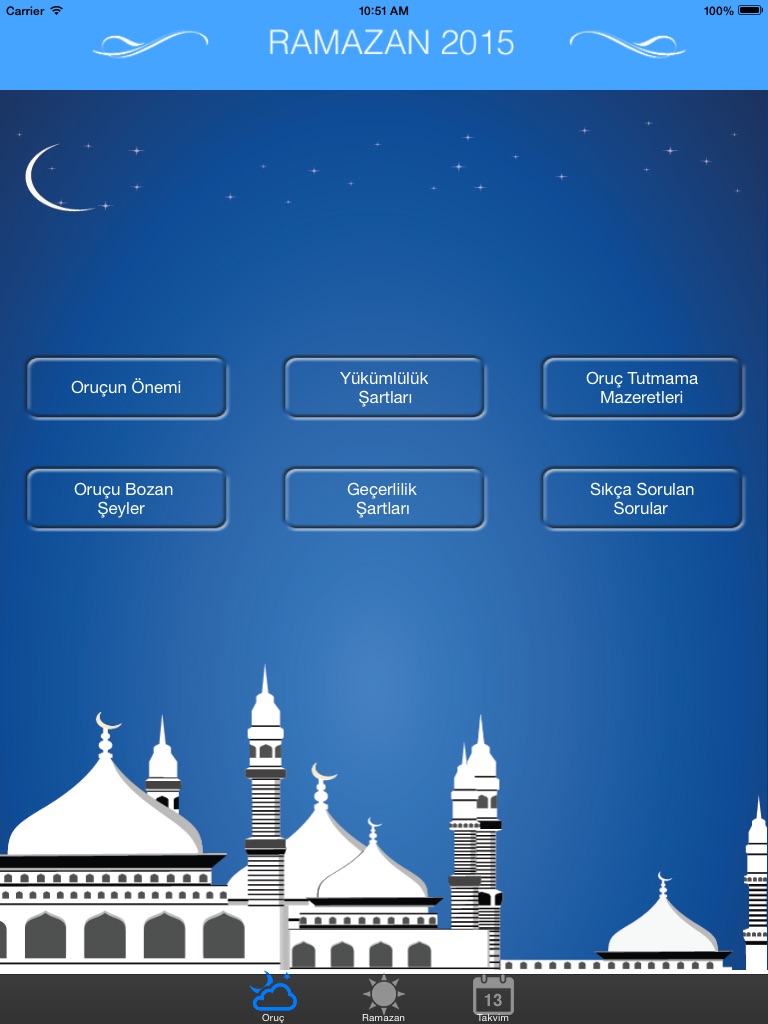 Ramazan 2015’te en çok sevilen uygulamalardan biri. Ramazan 2016 ücretsiz uygulamasında ramazan ile ilgili tüm bilgileri, güncel iftar ve sahur vakitlerini, ramazan dualarını, oruçla ilgili en sık sorulan soruları, oruç kabul şartları, oruç mazeretleri gibi önemli konuları ve 2016 senesi fitre rakamlarını bulabilirsiniz.