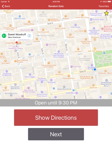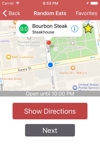 You can see the restaurants rating and can tap on the restaurants name to get more detailed information. If it looks good to you, you can quickly navigate there using the "Directions" button, if not you can tap "Next" to find another restaurant.